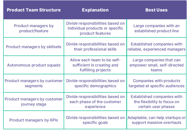 Best for: This product structure is most suitable for companies with long-tenured, reliable contributors. You need professionals familiar with your business offerings who can effectively collaborate with fellow managers. They can use their expertise on a certain business aspect to help produce successful products across multiple departments.